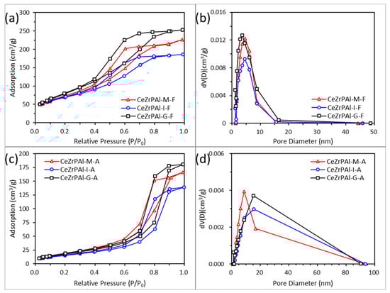 The structural parameters of a support before and after aging can indicate the stability of the support, determining the quality of the support. Figure 3 shows the adsorption-desorption isotherms of fresh and aged CeZrPAl samples prepared using different methods. From Figure 3a,b, it can be observed that the CeZrPAl samples prepared using different methods exhibit similar adsorption isotherms and hysteresis loops before and after aging, indicating that the preparation method has no significant effect on the pore type of the CeZrPAl samples. According to the IUPAC classification, both fresh and aged CeZrPAl samples exhibit type IV isotherms []. The fresh CeZrPAl sample exhibits an H2 hysteresis loop and has a pore structure characterized by cylindrical and ink bottle-shaped mixed pores, where the pore openings are similar in size to the pore channels/cavities, facilitating mass and heat transfer during reactions []. After high-temperature aging, the CeZrPAl samples undergo a transition from an H2 hysteresis loop to an H3 hysteresis loop, and the pore structure changes from cylindrical and ink bottle-shaped mixed pores to slit-shaped pores. The slit pores might be narrow gaps formed through the sintering and aggregation of particles during the samples’ aging [].