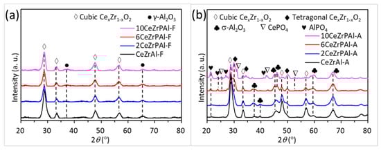 Figure 4 shows the XRD patterns of fresh and aged CeZrPAl composite oxides with different P contents. From Figure 4a, it can be observed that all fresh CeZrPAl samples exhibit diffraction peaks at 2θ = 28.5°, 33.2°, 37.6°, 47.8°, 56.8°, and 76.8°, corresponding to the cubic phase of the CexZr1−xO2 solid solution (JCPDS#28-0271), as well as diffraction peaks at 2θ = 37.6°, 43.2°, and 67.0°, corresponding to γ-Al2O3 (JCPDS#47-1308). With an increase in the P content, the intensity of the diffraction peaks of the cubic-phase CexZr1−xO2 solid solution and γ-Al2O3 significantly decreases, indicating that the addition of P reduces the crystallinity of the CexZr1−xO2 solid solution and γ-Al2O3 in the CeZrPAl samples []. In Figure 4b, it can be seen that after aging, the diffraction peak of γ-Al2O3 disappears at 2θ = 66.5°, and new diffraction peaks of δ-Al2O3 appear at 2θ = 36.7°, 39.5°, 45.6°, 60.1°, and 67.0° (JCPDS#46-1133), indicating a complete phase transformation of γ-Al2O3 to δ-Al2O3. The CexZr1−xO2 solid solution in the aged CeZrAl and 2CeZrPAl samples still maintains a cubic phase structure, with only a significant increase in diffraction peak intensity. The result indicates that the CexZr1−xO2 solid solution undergoes sintering during the aging process, leading to agglomeration and an increase in size. However, in the aged 6CeZrPAl and 10CeZrPAl samples, significant phase separation occurred in the CexZr1−xO2 solid solution. Not only are there diffraction peaks of the cubic CexZr1−xO2 solid solution at 2θ = 28.5°, 33.2°, 47.8°, 56.8°, and 76.8°, but there are also diffraction peaks of the tetragonal-phase CexZr1−xO2 solid solution appearing at 2θ = 29.7°, 34.4°, 49.6°, 59.7°, and 73.7° (JCPDS#38-1437). The results indicate that phase separation of CexZr1−xO2 occurs at high temperature when the P content in the CeZrPAl samples exceeds 6 wt.%. In the aged 6CeZrPAl and 10CeZrPAl samples, the diffraction peaks of AlPO4 appear at 2θ = 21.2°, 23.8°, and 27.1° (JCPDS#20-0045), and the diffraction peaks of CePO4 appear at 2θ = 25.3°, 31.2°, 42.0°, and 52.8° (JCPDS#04-0632). With an increase in the P content, the intensities of the diffraction peaks of AlPO4 and CePO4 significantly increase, indicating a higher content of AlPO4 and CePO4 in CeZrPAl samples with a higher P content. However, no diffraction peaks of AlPO4 and CePO4 are observed in the fresh and aged 2CeZrPAl samples. This might be because AlPO4 and CePO4 are highly dispersed in an amorphous form in fresh CeZrPAl samples, and with the increase in calcination temperature, AlPO4 and CePO4 gradually crystallize and grow. In addition, the phosphorus content is low in the 2CeZrPAl samples, and the content of AlPO4 and CePO4 in the aged sample is still below the detection limit of XRD; thus, no diffraction peaks of AlPO4 and CePO4 are observed.