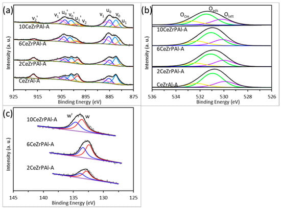Figure 5a–c show the Ce 3d, O 1s, and P 2p XPS spectra of CeZrPAl composite oxides with different phosphorus contents after aging at 1000 °C, respectively. From Figure 5a, it can be observed that the Ce 3d XPS spectrum contains ten characteristic peaks, where v0, v1, v2, v0′, v1′, and v2′ correspond to the characteristic peaks of Ce4+ 3d5/2, and u0, u1, u0′, and u1′ correspond to the characteristic peaks of Ce3+ 3d5/2 [,]. In Figure 5b, it can be seen that the O 1s XPS spectrum contains three characteristic peaks, where Olatt corresponds to the lattice oxygen on the surface, Oads corresponds to the adsorbed oxygen species (e.g., O2−, O2−2, O−), and OOH corresponds to the adsorbed water on the surface [,]. In Figure 5c, the P 2p peak contains two characteristic peaks: P 2p1/2 and P 2p3/2. The separation of the binding energies between the two peaks is approximately 1.0 eV, which is consistent with the value reported in []. Compared with the CeZrAl sample, it can be observed that the Ce 3d, O 1s, and P 2p spectra of the 2CeZrPAl, 6CeZrPAl, and 10CeZrPAl samples gradually shift towards higher binding energies. As discussed earlier, it might be attributed to the increasement in the covalent composition of the metal–oxygen and the decrease in the Fermi level and acidity []. The result also indicates that there is an interaction between Ce and P, which becomes stronger with an increase in the P content []. Table 4 presents the relative percentage of surface Ce3+ and Oads content in CeZrPAl samples, which were calculated based on the fitting peak area ratio of Ce3+/(Ce3+ + Ce4+) and Oads/(Olatt + Oads + OOH). Table S3 shows the surface P content measured on SEM-EDS. From the table, it can be seen that no P was detected in the fresh and aged samples of CeZrAl and 2CeZrPAl. It might be because the CeZrAl was a blank sample and the P content added to 2CeZrPAl was relatively low and evenly distributed. It is interesting that the peak of P 2p can be detected through XPS but cannot be detected through EDS, which might be because of the lower detection limit of the instrument. As the amount of P added increased, the detected P content on the surface of the support gradually increased. This result is consistent with the XPS result.
