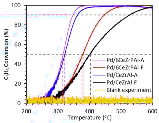 C3H8 is a common hydrocarbon in automotive exhaust emissions, which causes atmospheric pollution. One of the most effective ways to reduce air pollution is the catalytic combustion of hydrocarbons []. As reported, Pd is the preferred active metal for C3H8 combustion [,]. In order to improve the performance of the catalyst, researchers have made many attempts. Many researchers mainly focus on the preparation of core–shell catalysts [], adding additives [], etc. Among them, adding additives can change the state of precious metals, the properties of supports, and the interaction strength between supports and precious metals, thereby altering the activation pathway of C3H8 and improving the activity of catalysts []. The ultimate goal of these catalysts research is to apply them in practice to reduce environmental pollution. Considering industrial applications, adding additives to catalysts is the easiest way to achieve the goal; therefore, it is very necessary to study the role of additives in catalysts. So far, various additives have been reported, such as metallic [,,] and non-metallic additives [,,,].