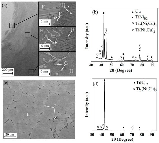 Figure 2 provides a detailed exploration of the SEM images and X-ray findings obtained from various points along the NiTi/Cu junction, offering valuable insights into its structural composition. Notably, the observation of an indistinct joint line between Cu and NiTi unveils a wide mixed zone spanning approximately 500 µm. Within this zone, a diverse array of constituents is observed, including the Ti (Ni,Cu)2 phase (designated as “E”), pure Cu inclusions (marked as “F”), Ti2 (Ni,Cu)3 precipitates (labeled “G”), and Ni-rich NiTi precipitates within the NiTi (Cu) phase (identified as “H”) (Figure 2a). The confirmation of the joint’s structural integrity is further reinforced by an analysis of the X-ray patterns (Figure 2b). Upon closer examination, a discernible reduction in the presence of Ti(Ni,Cu)2 and Ti2(Ni,Cu)3 precipitates is noted as one moves away from the joint towards the NiTi side. Conversely, the proportion of the NiTi(Cu) phase gradually increases in regions farther from the joint. In the NiTi layers, predominantly comprising the NiTi(Cu) phase, only minimal Ti2(Ni,Cu) precipitates are observed along the NiTi(Cu) grain boundaries (Figure 2c). Notably, the Cu concentration within the NiTi phase exhibits a decrease from 15 at. % near the joint to 1% in the uppermost NiTi layer. Despite positional variations, the combined Ni+Cu concentration within the NiTi phase consistently surpasses 50 at. %, with Ni concentrations ranging from 51 to 52 at. %, even within the upper layers. The X-ray analysis (Figure 2d) corroborates the presence of an austenite structure in the NiTi phase at room temperature, in line with the chemical composition detected through EDS analysis.