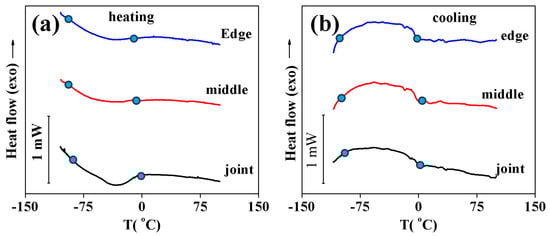 Figure 3. Calorimetry curves obtained upon cooling (a) and heating (b) samples cut from various location of the NiTi layers in NiTi/Cu bimetallic junction.