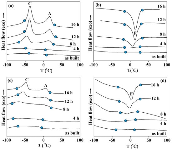 The low transformation enthalpy and wide temperature range show that the samples are not able to demonstrate good functional properties. Thus, the martensitic transformation should be improved by heat treatment. To study the influence of heat treatment on the martensitic transformation, the samples were annealed at 500 °C for 4–16 h. Figure 4 shows the calorimetric curves measured in the samples cut near the joint after different heat treatments. It can be seen that annealing for 4 h at 500 °C leads to the observation of four peaks on cooling and three peaks upon heating. Using this special procedure, it was found that, upon cooling, peak A was caused by the B2 → R transformation and peak C corresponded to the R → B19′ transformation. On heating, this B19′ phase transformed to a B2 phase within peak F. The peaks B and G were due to the B2 ↔ B19′ transformations; peaks D and E were caused by the same B2 ↔ B19′ transformation. The observation of different sequences of the transformation was due to the NiTi layer near the joint having various distributions of the Ti and Ni concentrations before annealing. This resulted in the annealing affecting, in various ways, the areas of the NiTi phase with different chemical compositions. In Figure 4, it can be seen that an increase in annealing duration increases the intensity and temperatures of all peaks. This was due to the Ni concentration in the NiTi phase decreasing during annealing, which increases the transformation temperatures and the volume fraction of the alloy undergoing the phase transformation. At the same time, a comparison of the calorimetric curves obtained after 12 and 16 h does not show any distinctions in transformation enthalpy or temperatures.