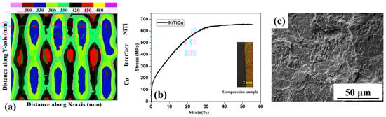 Figure 6a depicts comprehensive hardness results for the NiTi–Cu joint and base material, showing an average micro-hardness of 485 HV. Employing a spatially distributed strategy, variations were measured at intervals of 1.5 mm (Y direction) and 0.5 mm (X direction). The increase in NiTi micro-hardness results from copper incorporation, causing precipitation in the α-Ti phase due to the solid solution hardening of Cu in the alloy matrix [33]. Internal stress-induced rise is driven by precipitates like Ti(NiCu)2, particularly at higher Cu concentrations [34]. Elevated micro-hardness and embrittlement stem from Cu amalgamation in the NiTi region. Enhanced micro-hardness in the samples with over 10% Cu underscores the inherent brittleness in Cu-based intermetallic compounds [39]. In Figure 6a, the bottom part shows the hardness for pure Cu (100%), the middle depicts 15% Cu in the interface with Ni (45%), and the top shows NiTi hardness with 1% Cu, 51% Ni, and 48% Ti. This shows how the hardness values correlate with phase or composition in different NiTi–Cu joint regions. Figure 6b shows the compressive results for the interface (NiTi–Cu) and NiTi. The compressive strength (650 MPa) decreases after Cu is added to NiTi due to the production of brittle intermetallics. The elasticity and ultimate strength were at their highest at the lowest percentage of Cu, and they steadily decreased as the Cu weight percentage increased [33,34,35,36]. The documented mechanical outcomes surpass those achieved through traditional NiTi–Cu joint fabrication [35], indicating superior joint strength when compared to alternative methods. Figure 6c illustrates the fractured surface of the welded joints. Fractures occur along the cross-section of the welded joint. A brittle-like failure was observed in the fusion zone and ductile features were observed along the soft copper base metal. Upon closer examination using SEM, additional features became apparent: in the NiTi-Cu weld, the fracture region displayed smooth step patterns with cleavage-like features (Figure 6c). Notably, failure transpired through the fusion zone rather than along the formed interface because the intermetallic embrittled fusion zone could not withstand the load. This degradation stems from microstructural alterations induced by the WAAM deposition process, particularly attributable to Cu-based intermetallic compounds. These compounds fail to enhance the superelastic behavior, thus contributing to the decline in the mechanical properties of the constructed joints [34,35,36,39].