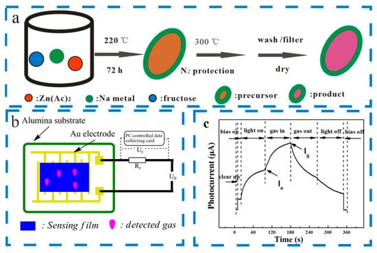 Samples were characterized by Raman spectroscopy (Horiba Jobin Yvon Company, Paris, France, LabRAM HR800), X-ray photoelectron spectroscopy (XPS) (Kratos Company, Manchester, UK, Axis Ultra DLD), X-ray diffraction (XRD) (Philips Company, Amsterdam, The Netherlands, X’Pert Pro), scanning electron microscopy (SEM) (FEI Company, Hillsboro, OH, USA, Sirion 200 FE-SEM), transmission electron microscopy (TEM) (JEOL Company, Tokyo, Japan, JEM-2100F STEM), and electron paramagnetic resonance (EPR) (BRUKER Company, Karlsruhe, Germany, EPR-E500). Photo-activated gas-sensing property testing was conducted on the solid film, partially based on our previously reported work []. Sensor devices were fabricated as followed. The as-prepared products (20 mg) were mixed with alcohol (2 mL) to prepare a powder suspension. And the dispersion solution was then gently released onto the gold interdigital electrode. The Au electrode was preprinted on the Al2O3 substrate. In order to improve the contact and its stability, all sensor devices were annealed under vacuum at 180 °C. The test platform was cleaned by dry air flow for 10 min before testing, and used a flat blue LED array light source (475 nm, 80 W/m2) with a 5 V bias voltage at 25 °C. The whole test process lasted 360 s, and was divided into the following stages: 0~5 s was the initial state stage of the test system; 5–10 s was the zero clearing stage of the test system; bias voltage was applied at 10 s; the light source was turned on at 20 s; the detecting gas was introduced into the detecting chamber at 100 s; the detecting gas was off at 180 s; the light source was turned off at 265 s; the bias voltage was turned off at 350 s, and the testing process ended at 360 s. The dry air and detecting gas were controlled by a gas flow meter, and photocurrent responses were recorded by a computer-controlled data collecting card (6008, National Instruments Cor., Austin, TX, USA). The gas flow meter and data collecting card were controlled by a computer program. Photo-activated gas sensors’ performances were calculated by photocurrent responses. The response value (Response, R) is defined as R = (Ig − Ia)/Ia, where Ia is the photocurrent before introducing detecting gas and Ig is the photocurrent after introducing detecting gas. Figure 1a shows a schematic illustration of the fabrication process for gas-sensing materials, and Figure 1b shows the detailed electrode configuration, the gas sensor’s structure, the procedure for photo-activated gas sensor testing, and a typical test curve.