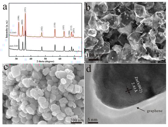 XRD patterns showed a hexagonal wurtzite structure (International Center for Diffraction Data (ICDD) 36-1452) of pure ZnO and G-ZnO samples, as shown in Figure 2a. Obvious diffraction peaks demonstrated that all samples were well crystallized. For the low content and low atomic number element of graphene, diffraction peaks of graphene were not detected, as previously reported by our group []. Figure 2b,c are typical FESEM images of G-ZnO and pure ZnO samples. As reported previously in the literature [], fructose can be transformed to graphene material by sodium under a reducing atmosphere. And the graphene was totally wrapped onto ZnO nanoparticles with an average diameter of 35.93 ± 11.49 nm, as shown in Figure 2b. Without graphene, the size of pure ZnO nanoparticles increased, with an average diameter of 86.03 ± 9.67 nm, as shown in Figure 2c. The particle size statistical method referred to the report of Francisco et al. []. The HRTEM image in Figure 2d shows the edge of silk-like graphene. With an interplanar distance of 0.261 nm, as shown in Figure 2d, the lattice fringe was assigned to the corresponding (002) plane of the hexagonal ZnO.