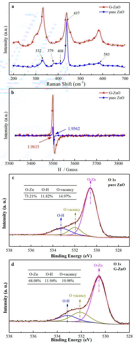 Raman (a), EPR (b), and XPS (c,d) spectra of G-ZnO and pure ZnO. The inserts in (c,d) are quantitative calculation results of O 1s based on fitting peaks.
