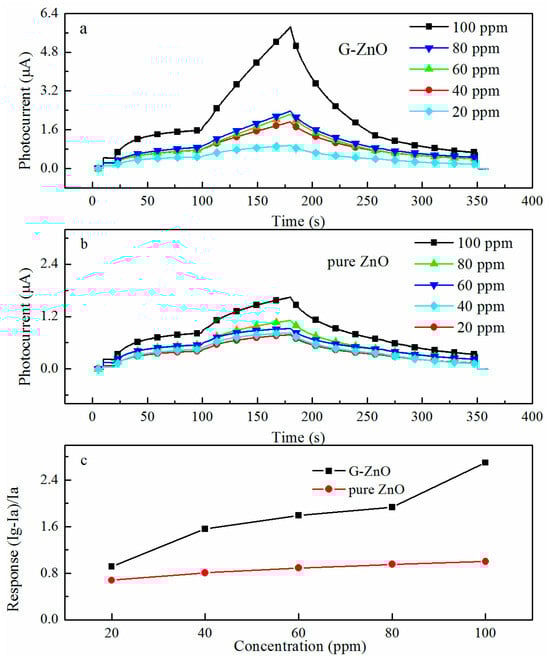 As these samples contained a tunable amount of oxygen vacancy defect, their photo-activated gas-sensing characteristics were expected to be different. As shown in Figure 4a,b, the dynamic sensing response of the two sensors to 100 ppm toluene was measured under blue light irradiation, and the corresponding responses were plotted against different toluene concentrations. The response of G-ZnO nanocomposites to toluene increased from 0.91 to 2.7 as the toluene concentration was enhanced from 20 ppm to 100 ppm. In contrast, the sensing response of pure ZnO nanocomposites to toluene increased from 0.68 to 1.0 as the toluene concentration was enhanced from 20 ppm to 100 ppm. Evidently, the response of G-ZnO nanocomposites to 100 ppm toluene was nearly 2.7 times larger than that of pure ZnO. So, the G-ZnO sensor showed remarkably enhanced photo-activated sensitivity to toluene at room temperature compared with the pure ZnO sensor.