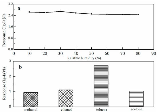 The sensing response of the G-ZnO sensor under different relative humidity (RH) conditions to 100 ppm toluene was also tested, as shown in Figure 5a. Results showed that at the RH range of 10–30% the gas-sensing response slightly increased. At the RH range of 30–80% the gas-sensing response slightly decreased. This decrease can be explained by the competition between the adsorbed water molecules and the chemisorbed oxygen species on the sensor surface. However, the gas-sensing response decreased slightly under a high humidity condition. This indicated that, even under a high humidity environment, the as-prepared gas sensor could operate effectively.