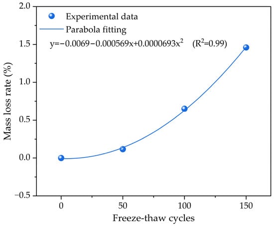 - The compressive mechanical test revealed that freezing–thawing conditions have a considerable impact on concrete. The relationship between the loss rate of compressive strength and the freeze–thaw cycles also follows a parabola fitting pattern, which is similar to the cumulative mass loss. As the number of freeze–thaw cycles increases, the compressive strength loss rate increases at a faster rate.