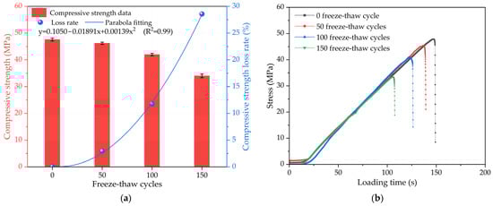 The compressive mechanical properties: (a) relationship between compressive strength of concrete and the number of freeze–thaw cycles; (b) stress–time curves under different amounts of freeze–thaw cycles.