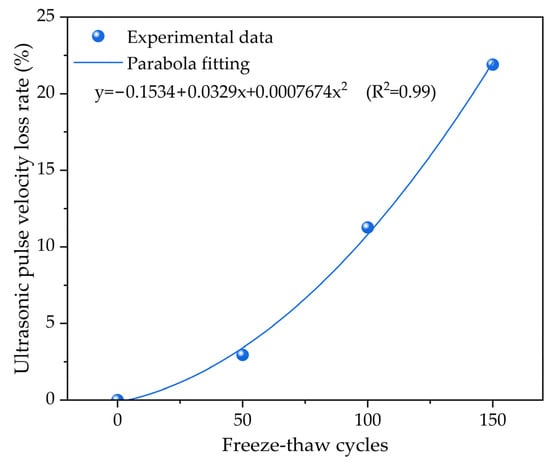 The results show that ultrasonic wave velocity gradually decreases with the freezing–thawing cycles. When the number of freeze–thaw cycles is 50, the ultrasonic wave velocity loss rate reaches approximately 2.95%. As the freeze–thaw cycles increase, the ultrasonic wave velocity loss rate increases at a faster rate. When the number of freeze–thaw cycles reaches 100, the ultrasonic wave velocity loss rate increases to approximately 11.27%, while the ultrasonic wave velocity loss rate increases to approximately 21.89% after 150 freeze–thaw cycles. The above results indicate that freeze–thaw cycling has a significant effect on the ultrasonic wave velocity of concrete. With respect to the polynomial fitting analysis of the ultrasonic wave velocity loss rate, it can be fitted using a quadratic polynomial equation. As the number of freeze–thaw cycles increases, the ultrasonic wave velocity loss rate shows a parabola trend. This trend may be attributed to the fact that as freeze–thaw cycling progresses, microcracks and defects in the concrete gradually increase, resulting in a rapid decrease in the ultrasonic wave velocity loss rate after a certain amount of freeze–thaw cycles. In summary, this finding provides valuable insights into monitoring and predicting the mechanical properties and service life of concrete in freeze–thaw cycling.