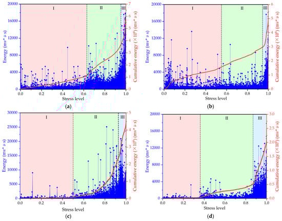 The relationship of the AE energy parameters of the concrete with the stress level under freeze–thaw cycling: (a) 0 freeze–thaw cycles; (b) 50 freeze–thaw cycles; (c) 100 freeze–thaw cycles; (d) 150 freeze–thaw cycles.