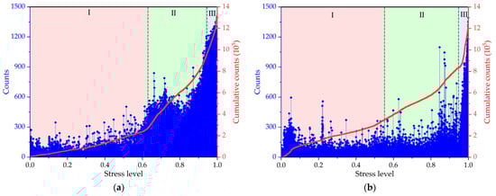 Figure 7 illustrates the correlation between the AE energy parameters and the stress level with freezing–thawing cycles. As shown in Figure 7, according to the value level as well as the cumulative value level of the AE parameter, the entire failure and cracking process of concrete under compressive loads can be divided into three stages, i.e., the linear growth stage, damage accumulation stage, and failure stage.