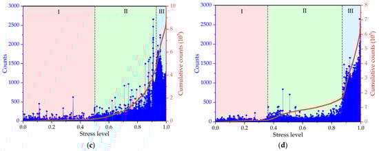 Figure 8 illustrates the correlation between the AE count parameters and the stress level. Under the same freezing–thawing action, the energy–stress level and AE count–stress level curves of the specimen exhibit similar evolution patterns during the compression failure process. And the entire failure process of concrete under compressive loads in relation to the AE count can be divided into the aforementioned three stages, i.e., the linear growth stage, the damage accumulation stage, and the failure stage. Stage I—linear growth stage: When the load is less than 40~60% of the peak load, the stress–AE cumulative count curve of the concrete shows linear growth behavior, and the AE cumulative count increases with the increase in load. The first stage is the stage of microcrack generation inside the concrete, in which the concrete specimens have sufficient strength to resist compression, resulting in a lower AE count [40]. Stage II—damage accumulation stage: When the load is between 40% and 90% of the peak load, the stress–AE cumulative count curve shows nonlinear behavior, and the AE cumulative count increases slowly with the increase in load. The second stage is the stage of concrete cracking and expansion, in which the internal microcracks of the concrete will gradually increase and expand with damage accumulation, and the count value collected with the AE technology also increases at a faster rate. Stage III—failure stage: When the load reaches about 85~90% of the peak load, the stress–AE cumulative count curve shows a sharp increase, indicating that the concrete is approaching failure. At this stage, the concrete specimen gradually reaches its maximum bearing capacity. The internal microcracks in the concrete will expand rapidly, and a large number of cracks will appear on the surface of the concrete. The values of AE count on the left vertical axes reach their maximum, approximately close to or above 1500 counts, showing that the specimen has an obvious fracture. The compressive bearing capacity of the specimen is then lost. The internal structure of concrete material is complex, which may affect the amplitude and distribution of AE signals. What is interesting in Figure 7c and Figure 8c is that there is a drop in the AE energy or count at about a 92% stress level, which is different from the other Figure 8a,b,d. This finding could be due to concrete microcracks accumulating and producing concentrated stress in the compression process, which might make the AE signal drop at a larger value level in the later failure stage.