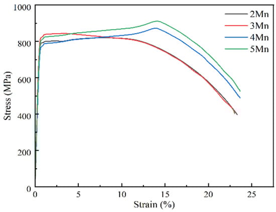 With the increase in Mn content, the tensile strength and yield strength of the test steel increase, but the tensile strength increases more significantly. With the increase in the Mn content from 2 to 5%, the tensile strength increases by nearly 100 MPa. Concurrently, the yield ratio decreases from 0.96 to 0.90, indicating that the test steel with a higher Mn content exhibits better strain-hardening ability.