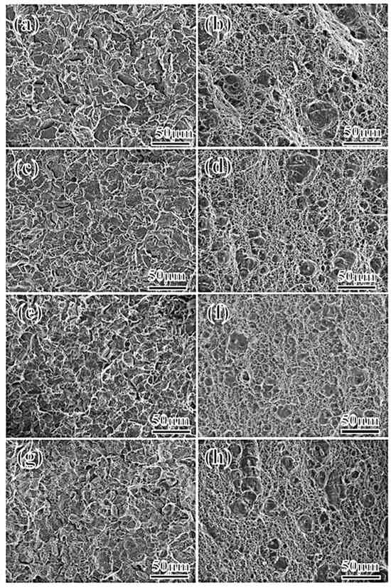 Fracture morphology of impact specimens of steel with different Mn content at 2Mn (a,b), 3Mn (c,d), 4Mn (e,f), and 5Mn (g,h).