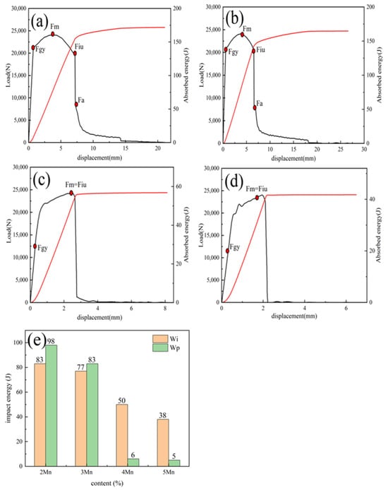 Load and absorbed energy vs. displacement curves with samples of 2Mn (a), 3Mn (b), 4Mn (c), and 5Mn (d); (e) part characteristic value of the oscillographic impact curve of steel with different Mn contents. Note: Fgy—yield force, Fiu—Unstable crack propagation initiation force, Fa—Unstable crack propagation termination force, Wi—crack initiation energy, Wp—crack propagation energy, Fm—maximal impact force, Sm—maximum load displacement.