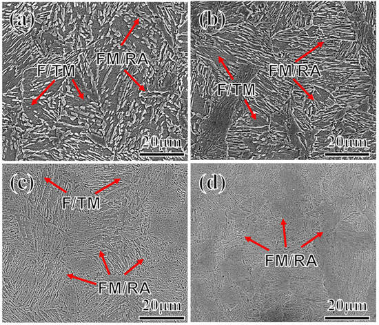 SEM images with samples of 2Mn (a); 3Mn (b); 4Mn (c); and 5Mn (d). (signaled by the red arrows: FM: fresh martensite, F: ferrite, RA: reverse austenite, TM: tempered martensite).