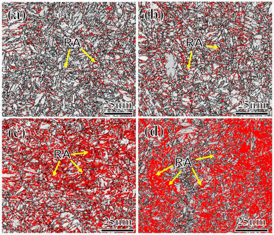 To further clarify the distribution and content of RA, EBSD analysis was conducted on the test steel, as shown in Figure 7. The red area in the figure indicates the presence of RA. The steel with higher Mn content exhibits a pronounced increase in the amount of RA. Regarding distribution, RA primarily occurs along the grain boundary and the lath boundary, which are the primary nucleation sites of RA, owing to the high energy present [35]. Regarding morphology, at a low Mn content (Figure 7a,b), RA appears mostly granular and strip-like, whereas, at higher Mn content (Figure 7c,d), blocky RA increases significantly in size. Considering stability from a volume fraction perspective, smaller-sized RA is more stable [36,37,38]. The statistics detailing volume fraction and grain size of the RA, measured via EBSD (test step 0.2 μm, pixel 600 × 600), are presented in Table 5, using four samples that use the same area (14,400 μm2). However, given the limited area sampled in EBSD, potential bias exists. Consequently, XRD is employed to further evaluate the austenite content. As shown in Figure 8a, the diffraction peaks of different Mn steels demonstrate an increase in the austenite diffraction peak with the increase in the Mn content; particularly, the integral intensity of the (002) diffraction peak increases significantly. Figure 8b displays the variation pattern of RA. The XRD test results generally align with the EBSD results, although slight deviations exist. This divergence is primarily attributed to the influence of EBSD resolution and sample surface quality. Owing to the large step size in EBSD, detecting smaller-sized austenite is challenging. Variations in the selected test area might also contribute to these deviations. In addition, it is also related to the selected test area. Even after tempering, variations persist within the microstructures of the material, which result in differences in the composition or distribution of phases across different regions of the material.