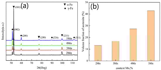 XRD patterns and austenite contents of steel with different Mn contents were tested: (a) XRD; (b) austenite content.