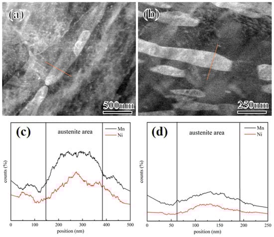 Figure 9 shows the transmission electron microscopy (TEM) images of 2Mn and 5Mn steels. As the Mn content increases, the amount of RA significantly increases, and the morphology gradually shifts from lath to a mix of lath and block [39,40]. The diffraction patterns of the RA in these samples predominantly indicate the γ-phase with an fcc structure. The distribution of RA exhibits a certain degree of orderliness, with most RA maintaining the same orientation as the original austenite [41]. Due to the higher tempering temperatures, the martensitic lath morphology is almost absent, and RA is uniformly distributed over the martensitic matrix. However, the formation sites of RA with different morphologies vary. In the 5Mn samples, a significant amount of blocky RA tends to form at the original austenite grain boundaries. The austenite nuclei at these grain boundaries maintain the Kurdjumov-Sachs (K-S) relationship with only one side of the matrix. These reverted austenite regions at the original austenite grain boundaries are enveloped by coherent and incoherent interfaces, leading to differences in surface energy and elastic strain energy on both sides, thereby facilitating the formation of blocky RA [42]. Analysis of the width of the lath RA in multiple TEM images reveals that the width increases from approximately 95 to 130 nm as the Mn content increases from 2 to 5Mn. The size of RA gradually coarsens, consistent with the EBSD statistical results. To examine the distribution of specific elements within the RA, STEM(scanning transmission electron microscopy)-EDS scanning was conducted on the RA in both 2 and 5Mn samples (Figure 10). According to Figure 10a,c, the Mn and Ni elements in 2Mn RA are significantly enriched, while the Mn and Ni enrichment of 5Mn is not high (Figure 10b,d). The high degree of segregation of Mn and Ni (which are stabilizing elements for austenite) indicates a higher stability of RA in 2Mn than in 5Mn.
