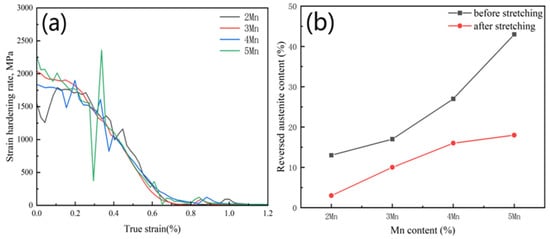 (a) Strain hardening rate curves of tested steels with different Mn content; (b) the change in austenite content before and after stretching.