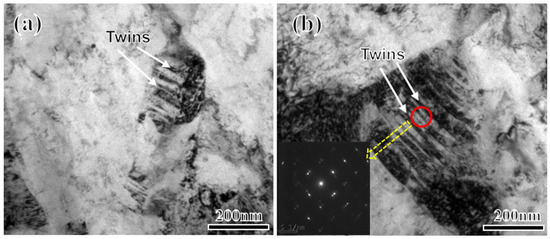 From a different perspective, the grain size of RA significantly increases from 2Mn (0.85 μm) to 5Mn (1.43 μm). The finer grain size provides shorter slip paths, making plastic deformation more prone to occur through slipping. To verify the existence of deformation twins, a sample is extracted from the fracture deformation zone of 4Mn and observed via TEM. Figure 12 illustrates the twin structure present in 4Mn.