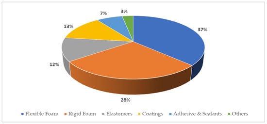 The first polyurethane (PU) was synthesized by Dr. Otto Bayer and his team in 1937 at IG Farbenindustries by reacting a polyester diol with a diisocyanate [1]. They developed a new polyisocyanate polyaddition process [2]. This discovery opened a new path in macromolecular chemistry and completely revolutionized the polymer and coatings industry [3,4]. The potential of this polyurethane was noticed during the Second World War when it was used for the impregnation of paper and the production of mustard gas-resistant clothing, high-gloss airplane finishes, chemical, and corrosion-resistant coatings to protect metal, wood, and masonry. With a relatively short history of just over 86 years, polyurethanes have become one of the most dynamic groups of polymers, and their field of application covers almost all areas of polymer use (Figure 1) [5,6,7]. The most common PU application is used to produce flexible foams and rigid foams.