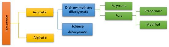 Isocyanates are chemical compounds containing the -N=C=O grouping, in which the binding atom is a nitrogen atom [20]. The classification of isocyanates is presented using Figure 3.