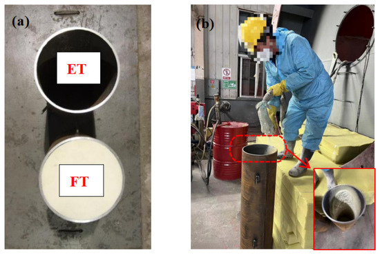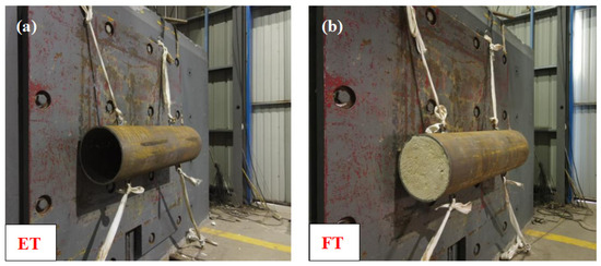 Four test specimens were prepared for the impact loading tests. The specimens were tubes measuring 1000 mm in length and 300 mm in diameter. The specimens labeled ET-1 and ET-2 were made of 20# steel tubes with thin walls that were 8 mm thick, and the ratio of diameter to thickness (D/t) is 37.5. The FT-1 and FT-1 specimens consisted of the same tubes, but they were filled with PU foam instead (as shown in Figure 2a). The PU was created via spray molding, a procedure that involves premixing polyester polyolare and isocyanate with high-pressure air, which was followed by spraying the mixture into the interior of a steel pipe. The ratio of isocyanate to polyester polyolar was 1.05:1, as indicated in Figure 2b.