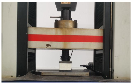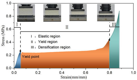 Following the Chinese code [27], the PU foam was made into a specimen of 100 mm × 100 mm × 50 mm (Figure 3), and an axial compression test was performed using a DNS-100KN-type electronic universal testing machine (Tongji University, Shanghai, China) (Figure 4) with a loading speed of 10 mm/min. The compressive stress–strain curve of the PU is shown in Figure 5. The compression process of the PU foam was divided into three stages: (I) the initial linear elastic response region, (II) the platform collapse with large deformation region, and (III) the densification region. First, the pore structure was deformed and exhibited stress concentration. As the load increased, the pore wall was bent, and the elastomer molecular chain broke after being subjected to stress, resulting in cracks on the pore wall and the collapse of the pore structure, which then extended along the laminar pattern. Finally, the entire specimen was compacted. Stage deformation occurred in a very small area, and its strain was less than 0.055. The compressive stress–strain curve for this stage could be approximated as a straight line, and the PU foam behaved elastically after being subjected to external forces. As the deformation increased, the deformation zone developed and collapsed layer by layer, which was the result of the joint action of the bending and folding of the hole wall. The change in the stress was relatively smooth at this stage, and the stress reached 0.45 MPa when the strain reached 0.8. When the walls of the specimen pores were squeezed together, the specimen entered the densification region because the substrate that constituted the wall of the pore was compressed, resulting in a sharp increase in stress.