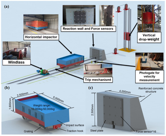 Experimental setup: (a) horizontal impact system, (b) horizontal impactor, and (c) reaction wall.