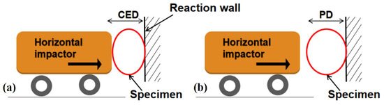 Impact tests were carried out using the horizontal impact system (Figure 6) of the Jiangsu Province Bridge Collision Prevention Engineering Technology Research Center in China. The test system consisted of a vertical drop-weight device combined with a horizontal impactor traction device (Figure 6a). A windlass was used to pull the horizontal impactor via the steel cable (Figure 6b), and the horizontal impactor synchronously pulled the vertical drop weight through the fixed pulley set. During the test, a vertical drop weight was used to pull the horizontal impactor against the specimen while it was fixed to the reaction wall (Figure 7) and the trip mechanism broke the link between the windlass and the horizontal impactor. Simultaneously, piezoelectric sensors were arranged on the reaction wall (Figure 6c) to measure the impact of the specimen on the reaction wall.