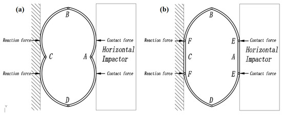 - Owens, R.H.; Symonds, P.S. Plastic Deformations of a Free Ring Under Concentrated Dynamic Loading. J. Appl. Mech. 1955, 22, 523–529. [Google Scholar] [CrossRef]
