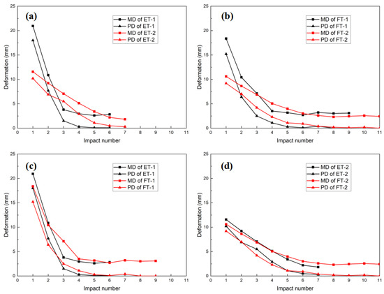 The maximum deformation (MD) and permanent deformation (PD) of the ET and FT specimens as a function of the number of impacts are shown in Figure 11a,b. The maximum PD of specimen ET-1 was 27.7 mm after the sixth impact, and the maximum PD of specimen ET-2 was 27.4 mm under the seventh impact. After the ninth impact, specimen FT-1 reached a maximum PD of 26 mm, and after the eleventh impact, specimen FT-2 reached a maximum PD of 25.7 mm.
