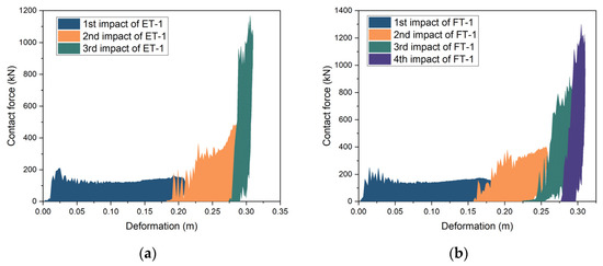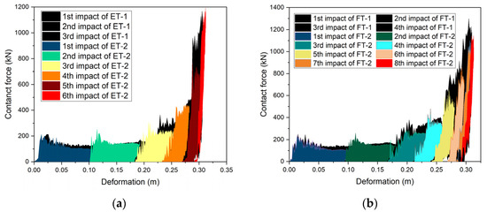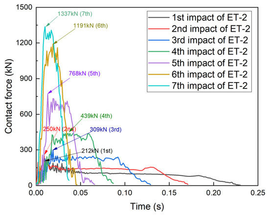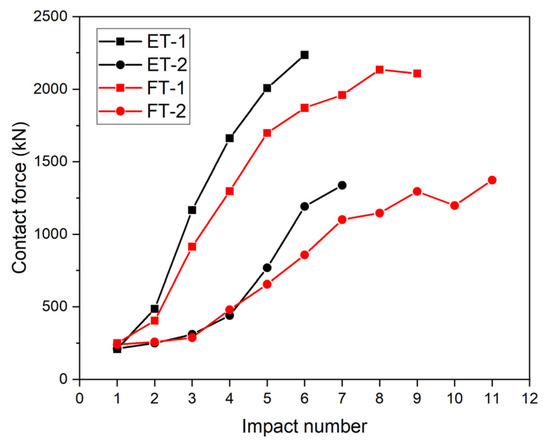 The variations in the peak contact force for each specimen are plotted in Figure 20. As the number of impacts increased, the peak contact forces on each specimen also increased. In particular, the contact force on specimen ET-1 rose from 209.7 kN after the first impact to a peak of 2237.1 kN. The difference in the contact force was greatest between the first and second impacts and between the second and third impacts. The contact force of the second impact was 2.3 times higher than that of the first impact, and the contact force of the third impact was 2.4 times higher than that of the second impact. The contact force of specimen ET-2 increased from an initial 211.9 kN to a peak of 1337.4 kN, and the maximum difference in the contact force occurred between the fourth and fifth impacts: the contact force of the fifth impact was 1.75 times that of the fourth impact.