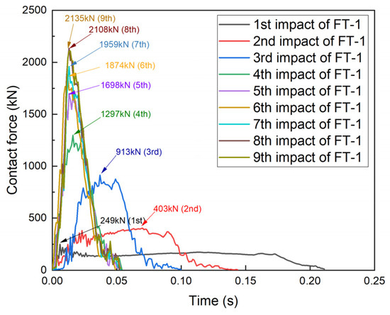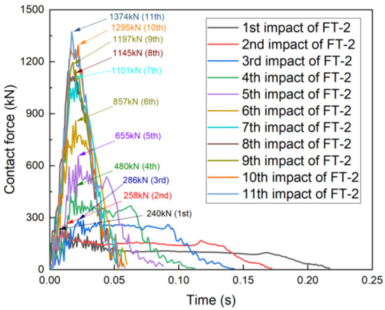 The contact force on specimen FT-1 increased from an initial 249.4 kN to a peak of 2135.5 kN, and the greatest difference in the contact force occurred between the second and third impacts: the contact force of the third impact was 2.7 times higher than that of the second impact. The contact force of specimen FT-2 increased from an initial 240.2 kN to a peak of 1374 kN, and the maximum difference in the contact force occurred between the fourth and fifth impacts: the contact force of the fifth impact was 1.67 times that of the fourth impact.