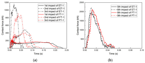 Contact force–time curves for specimens ET-1 and FT-1: (a) first to third impacts and (b) fifth to ninth impacts.
