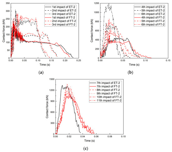 Contact force–time curves for specimens ET-2 and FT-2: (a) first to third impacts, (b) fourth to sixth impacts, and (c) seventh to eleventh impacts.