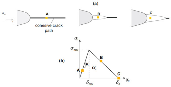 The cohesive method concept: (a) represents the cohesive zone concept, and (b) represents the bilinear cohesive stress-displacement relationship for quasi-brittle material [15].