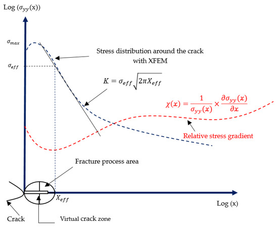 To use the volumetric method, we followed the approach shown in Figure 3. We first introduced the geometric model with the behavior law, which aims to model the behavior of solids by an empirical law during deformation. We then plotted the stress distribution along the crack using the XFEM. Then, to calculate the parameters of the volumetric method (effective stress and effective distance ), we calculated the relative stress gradient. By combining the two curves (stress distribution and relative stress gradient), as represented in Figure 4, we obtained the effective distance, which represents the minimum of the curve, and by projecting this distance onto the stress distribution curve, we obtained the effective stress. At the end of this procedure, the SIF, represented by K, was obtained.