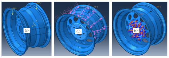 The finite element analysis was carried out by taking into account the radial test load and the impact of the tire inflation pressure . In order to make the simulation closer to reality, we took the conditions that were in the experimental test. Figure 7 represents the configuration adopted in this simulation. For the loads, they were distributed as follows: to apply the effect of the inflation area of the tire, the force is represented as shown in Figure 7a, and to represent the contact between the tire bead and seat rim, we applied a force as represented in Figure 7b. The wheel rim was clamped on out bolt holes as shown in Figure 7c.