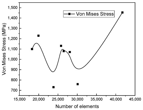 In the mesh part, the rim was partitioned to have a finer mesh at the ventilation holes. Therefore, the partitioned parts have fine mesh and the rest of the structure a coarse mesh. Figure 8 visualizes the distribution of the mesh within the model. C3D10 is the element type that was used to represent the wheel rim as a three-dimensional solid continuum; it is suitable for simulating complex geometric shapes with curved surfaces. To enhance the accuracy of the outcome, the solid’s mesh was refined. Mesh sensitivity was performed to select an adequate mesh, which can produce acceptable simulation results. Figure 9 shows that as the number of elements increases, the von Mises stress changes. This is because changing mesh size affects the XFEM model [35] and a different solution was obtained. An optimum mesh size of 15 mm was adopted in this work in order to study the cracking that occurs in the ventilation holes. The result was stabilized with 49,862 as the total number of nodes and 25,810 as the number of elements.