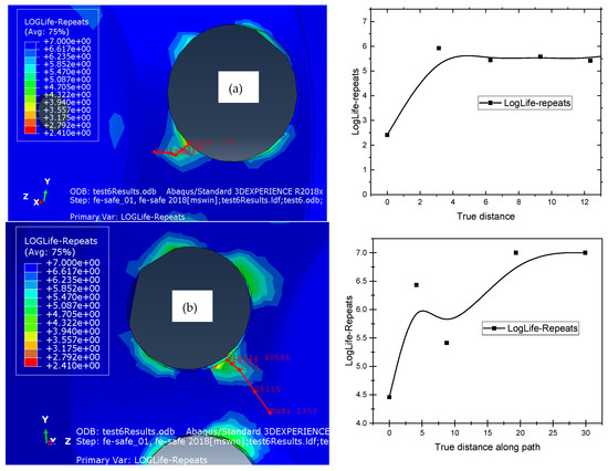In order to be able to study the fatigue life of the wheel disc, stress-based methods were adopted in this study. The Loglife repeats were estimated at the critical region in the outer and inner surfaces, and the results of the fatigue studies for the two surfaces are given in Figure 10. Figure 10 shows the Fe-Safe simulation result, and in the critical areas we identified, we plotted the Loglife repeats near these regions. From these results, we were able to estimate the number of cycles where there is a stress concentration, i.e., the critical zone, and we presented the results along the distance, which is near this zone. These results show that the inner surface in Figure 10a has a longer life than the upper surface in Figure 10b. If we only take the point on the edge of the hole for the inner surface, we have 4.5 of Loglife repeats that correspond to load life repeats, and for the outer surface, we have 2.4 of LogLife repeats that correspond to . According to the model results, it can be mentioned that the initiation of the crack will start from the outer surface, and after cycles, it can appear on the inner surface.