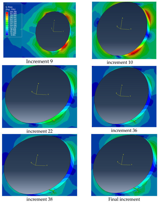 The analysis performed in this paper is a static analysis using ABAQUS 2017 software. The numerical simulation showed that the stress is concentrated in specific areas on the air ventilation holes and, in these regions, a crack began to initiate. The numerical results obtained correspond well with the experimental test in Figure 11. In this study, the initiation was performed in regions with a high stress concentration, after increment 10, the first stage of propagation occurs. The different stages of surface degradation are represented in Figure 12. It is clear that in the area of concentrated stress (in red), a crack has begun to appear, and with increments, we can see the crack opening.