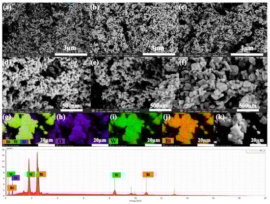 SEM analysis of the BWO NPs synthesized at 400 °C (a,d), 500 °C (b,e), 600 °C (c,f), and the elemental mapping (EDS) images (g–k) of BWO400.