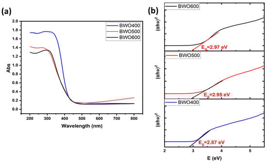 The resulting Eg values were found to be 2.87, 2.95, and 2.97 eV for BWO400, BWO500, and BWO600, respectively (Figure 4b).