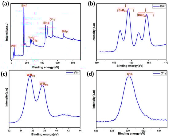 X-ray photoelectron spectroscopy (XPS) was also employed to determine the chemical states and surface chemical composition of the BWO400. Figure 5a presents the survey spectrum of the BWO400 material composed of W, Bi, and O elements and a little carbon trace. The existence of carbon can be explained by the use of a carbon tape within the XPS analysis [51]. Figure 5b shows the spin-orbit components of Bi 4f by two intense peaks found at 164.41 and 159.14 eV, assigned to the 4f5/2 and 4f7/2 states of the Bi3+ crystal structure, respectively [51]. Another spin-orbit doublet at 162.10 and 156.76 eV for Bi 4f5/2 and Bi 4f5/2 was also seen, respectively [52]. The peaks at 35.5 and 37.6 eV, as illustrated in Figure 5c, equivalent to W 4f7/2 and W 4f5/2, respectively, may be ascribed to a W6+ oxidation state [51,53,54]. Figure 5d reveals the existence of an oxygen element (O1s) via the clear, strong peak at 530.1 eV, which is assigned to the crystal lattice oxygen [55].