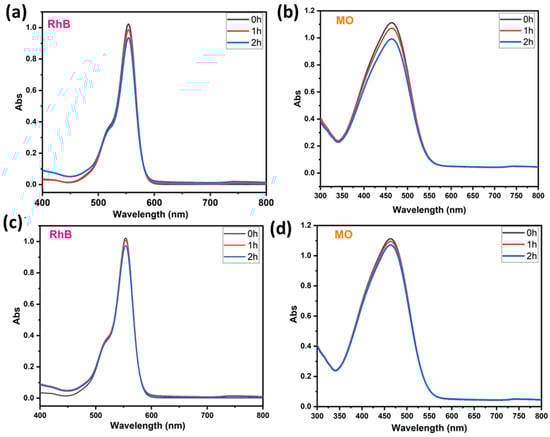 To prove the capability of our BWO400 material, it is important to study the adsorption of the pollutant in the absence of UV-vis illumination. Hence, the photolysis test enables the quantification of the photocatalytic decomposition contribution under our running parameters. Therefore, preliminary investigations were undertaken to check the contribution of the adsorption and the photolysis to the removal of the pollutant (case of RhB and MO). Figure 6a,b show the absorption curves of RhB (554 nm) and MO (463 nm) in the presence of BWO400 photocatalyst and in the absence of irradiation. It can be easily seen that the decline in the absorbance intensity of the highest RhB absorption bands is not more than 9% after 2 h of contact (Figure 6a), whereas in the MO it was 10.8% after 2 h of contact (Figure 6b). These results indicate very little adsorption of RhB and MO by the BWO400 material. The photolysis tests (absence of BWO400) were carried out on solutions (MO and RhB) with an initial dye concentration of 5 ppm under UV-vis illumination. Figure 6c,d reveal that in the absence of the BWO400 photocatalyst, only a reduction of 5% and 4% in the absorbance intensities was achieved after 2 h of illumination for RhB and MO, respectively. From these findings, we are able to confirm that the major process implicated in the removal of MO and RhB in the presence of BWO400 photocatalyst is principally photocatalytic decomposition instead of adsorption and photolysis processes.